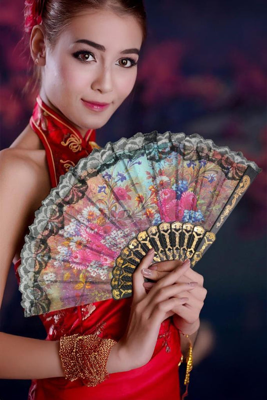 Dantel Kenarlı Renkli Çiçek Desenli Yelpaze