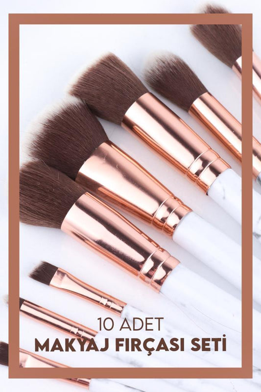 10'lu Makyaj Fırça Seti Mermer Desenli Beyaz Sap - Siyah Uç