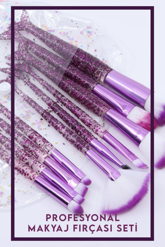 10'lu Makyaj Fırça Seti Çantalı Şeffaf Simli Balık Mor