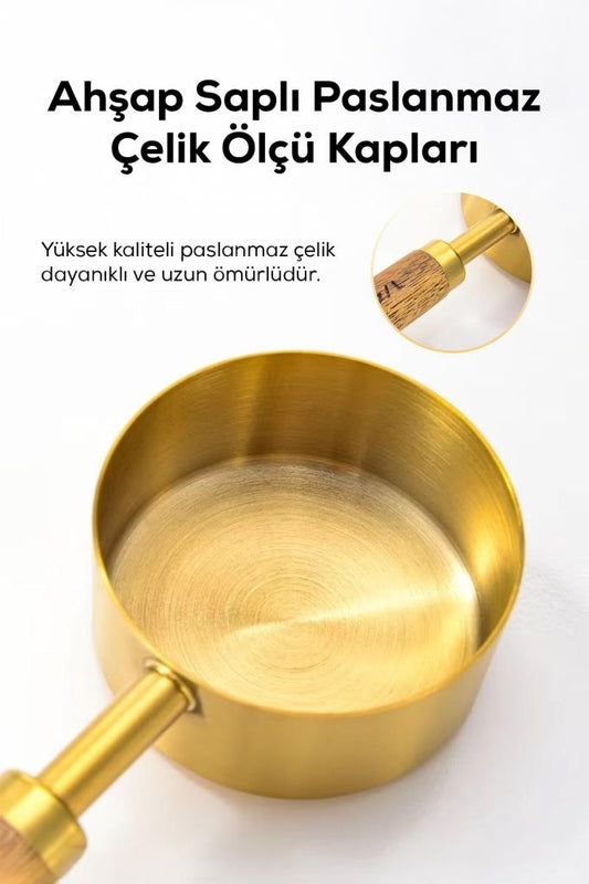 4’lü Ahşap Saplı Gold Paslanmaz Çelik Ölçü Kabı Seti