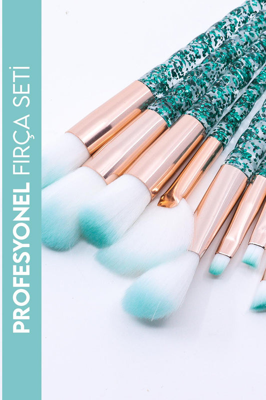 10'lu Makyaj Fırça Seti Simli Mavi Renk Örgü Sap