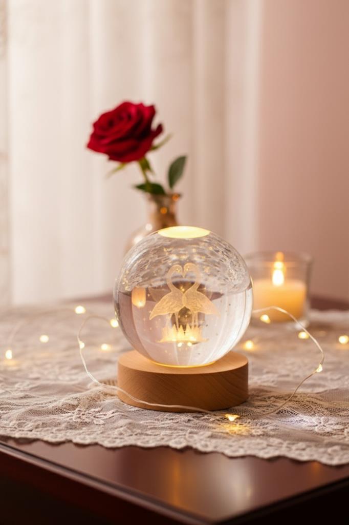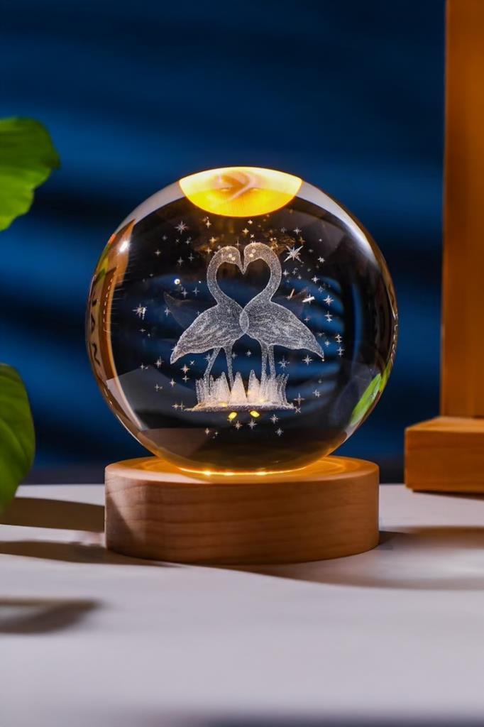 🩵 3D Lazer Kazıma Teknolojisi: Küre içinde yer alan başlarını birleştirerek kalp oluşturan iki kuğu figürü, yüksek hassasiyetli lazer teknolojisiyle kristalin içine işlenmiştir.