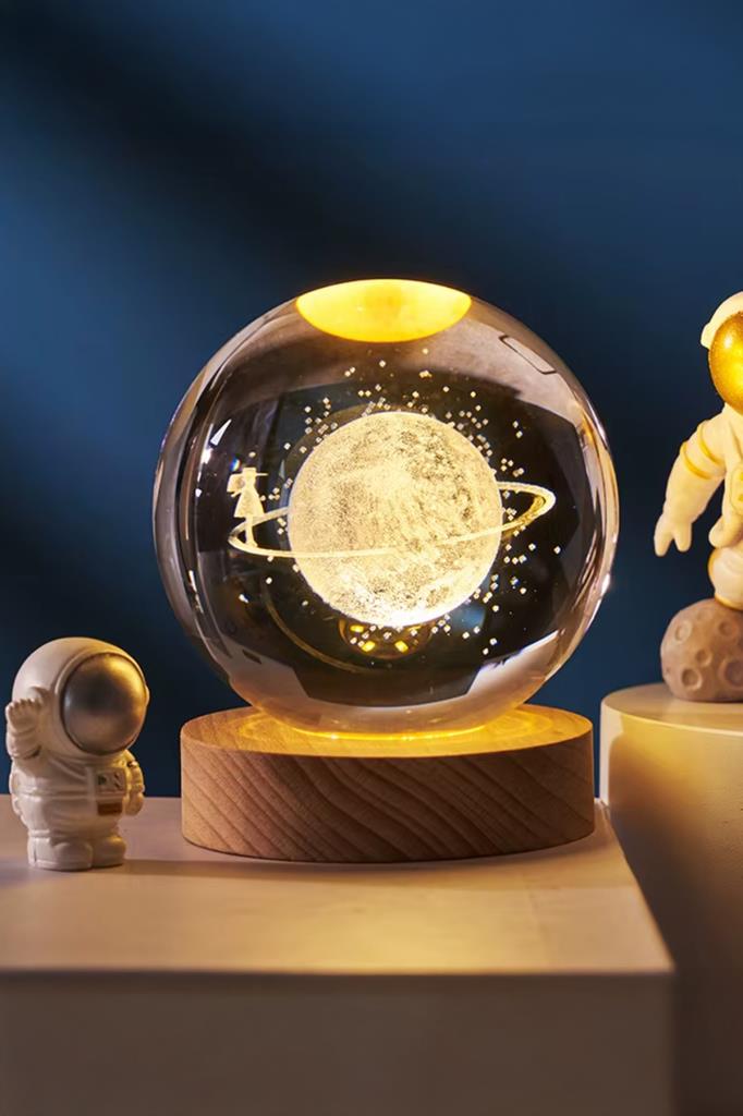 🔹 3D Lazer Kazıma Teknolojisi: Küre içinde yer alan Satürn gezegeni ve etrafında yürüyen figür, lazerle kristalin içine işlenmiştir.