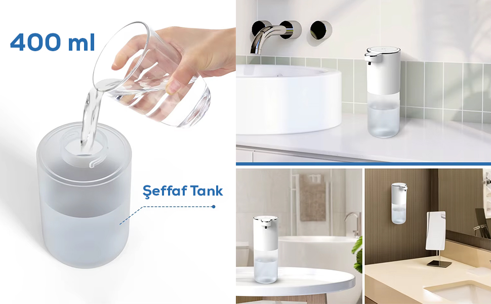 ✨ Büyük Kapasiteli Şeffaf Hazne: 400 ml şeffaf haznesi sayesinde sabun seviyesini kolayca takip edebilir, sık sık doldurmak zorunda kalmazsınız.