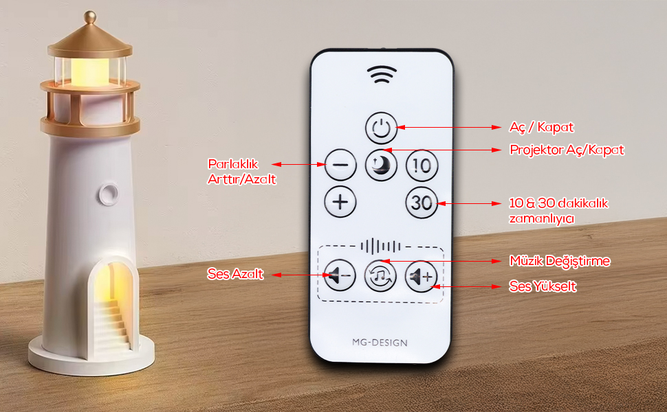 *Açma/Kapama, ses artır/azalt, ışık modu değişimi ve zamanlayıcı (10/30 dakika) gibi fonksiyonları uzaktan yönetebilirsiniz.
