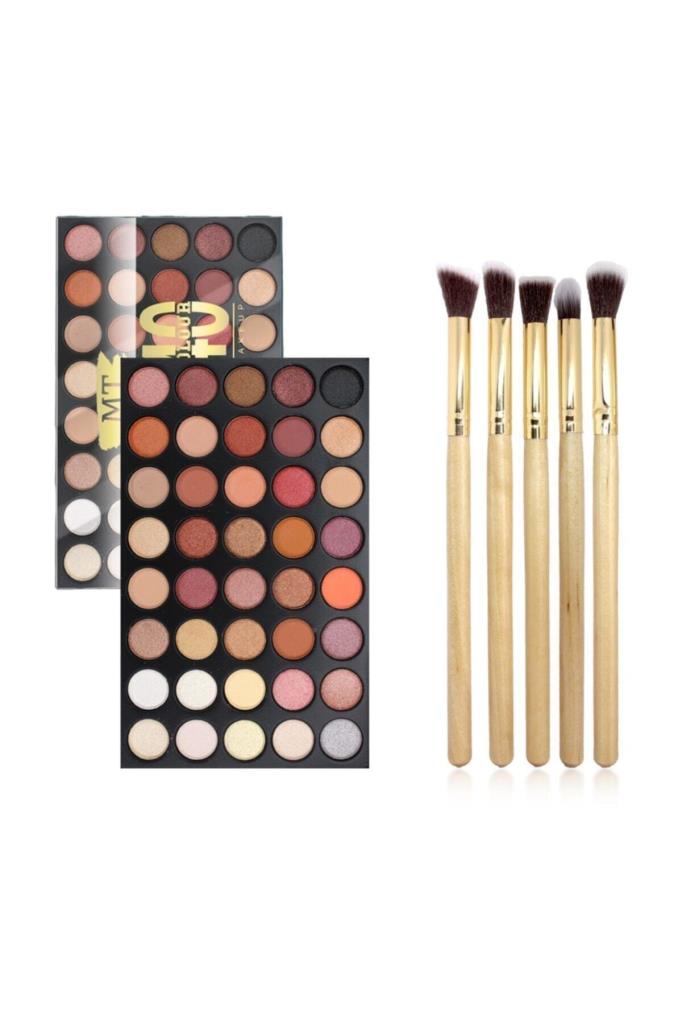(KIRILABİLİR) 2'li Makyaj Takımı 40'lı Sedefli - Mat Far Paleti + 5'li Far Fırça Seti Uzun Saplı Kahverengi